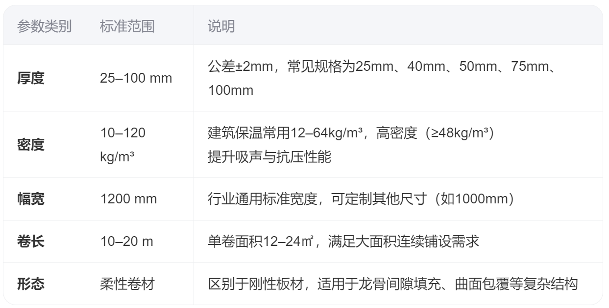 無甲醛玻璃棉氈的規(guī)格體系以?GB/T 13350-2017?為基準,核心參數(shù)為:?厚度25–100mm、密度10–120kg/m3、幅寬1200mm、卷長10–20m?,形態(tài)為柔性卷材。