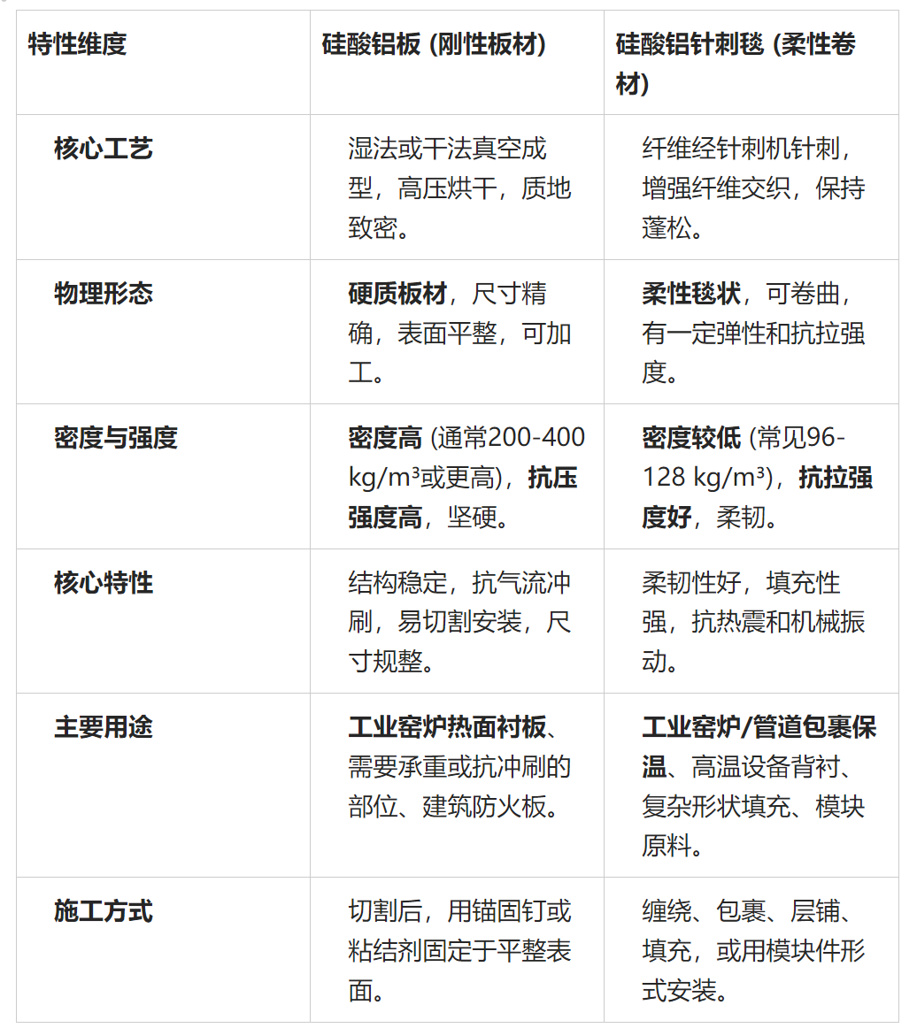 簡單來說,硅酸鋁板是“堅硬的隔熱磚”,而硅酸鋁針刺毯是“強韌的保溫被”。它們都以硅酸鋁纖維為原料,但通過截然不同的工藝制成,性能和應用場景區(qū)別很大。