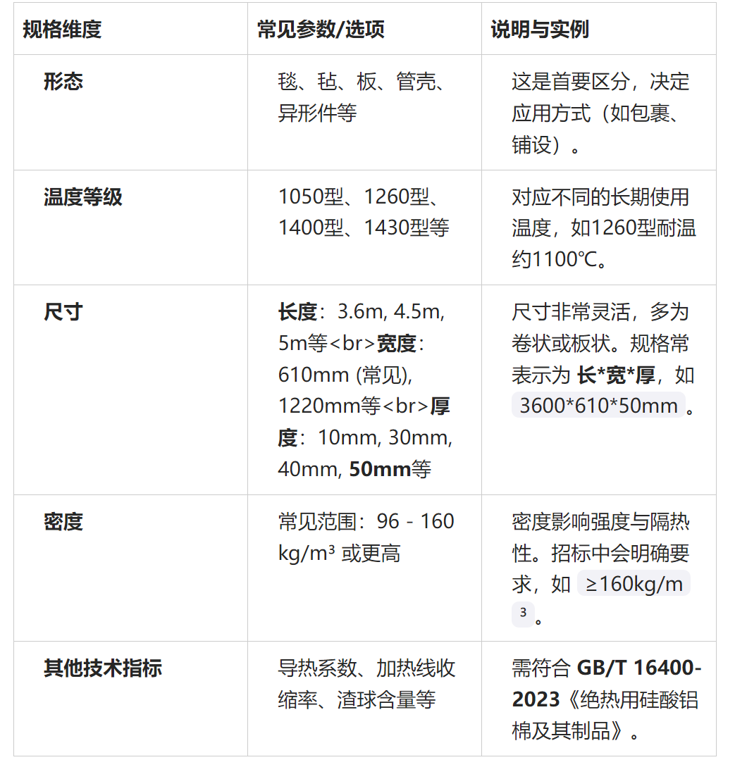 硅酸鋁保溫棉沒有單一的“型號”,其規(guī)格是一個包含尺寸、密度、溫度等級、形態(tài)等多維度的體系。根據(jù)多個采購項目和企業(yè)產(chǎn)品信息,常見的規(guī)格參數(shù)如下: