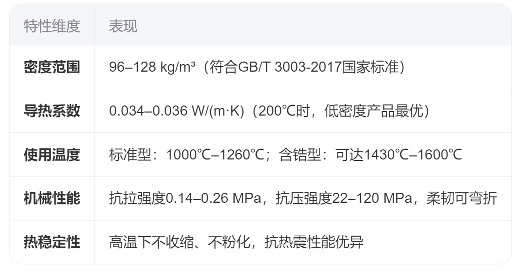 主流產(chǎn)品容重?:?96–128 kg/m3?該范圍為工業(yè)通用標(biāo)準(zhǔn),適用于絕大多數(shù)高溫隔熱場(chǎng)景,涵蓋普通型與高鋁型硅酸鋁纖維毯。